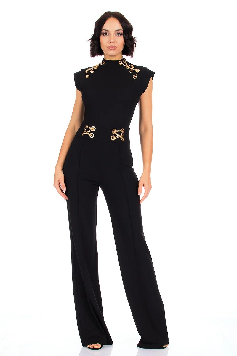 EYELET WITH CHAIN DEATILED FASHION JUMPSUIT. CAP SLEEVE, CHAIN DETAIL ON THE SHOULDER AND THE WAIST