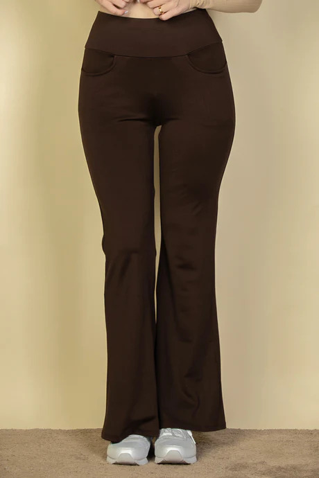 High Waisted Front Pocket Flare Pants. Soft sleek & Medium weight stretch novelty premium knit. Women’s pants with very soft stretchy fabric.. Feature: High waisted, front pocket, flared. Occasion: These active pants are suitable for loungewear, work, sport, home, shopping, activities and daily life.. Suitable for every seasons