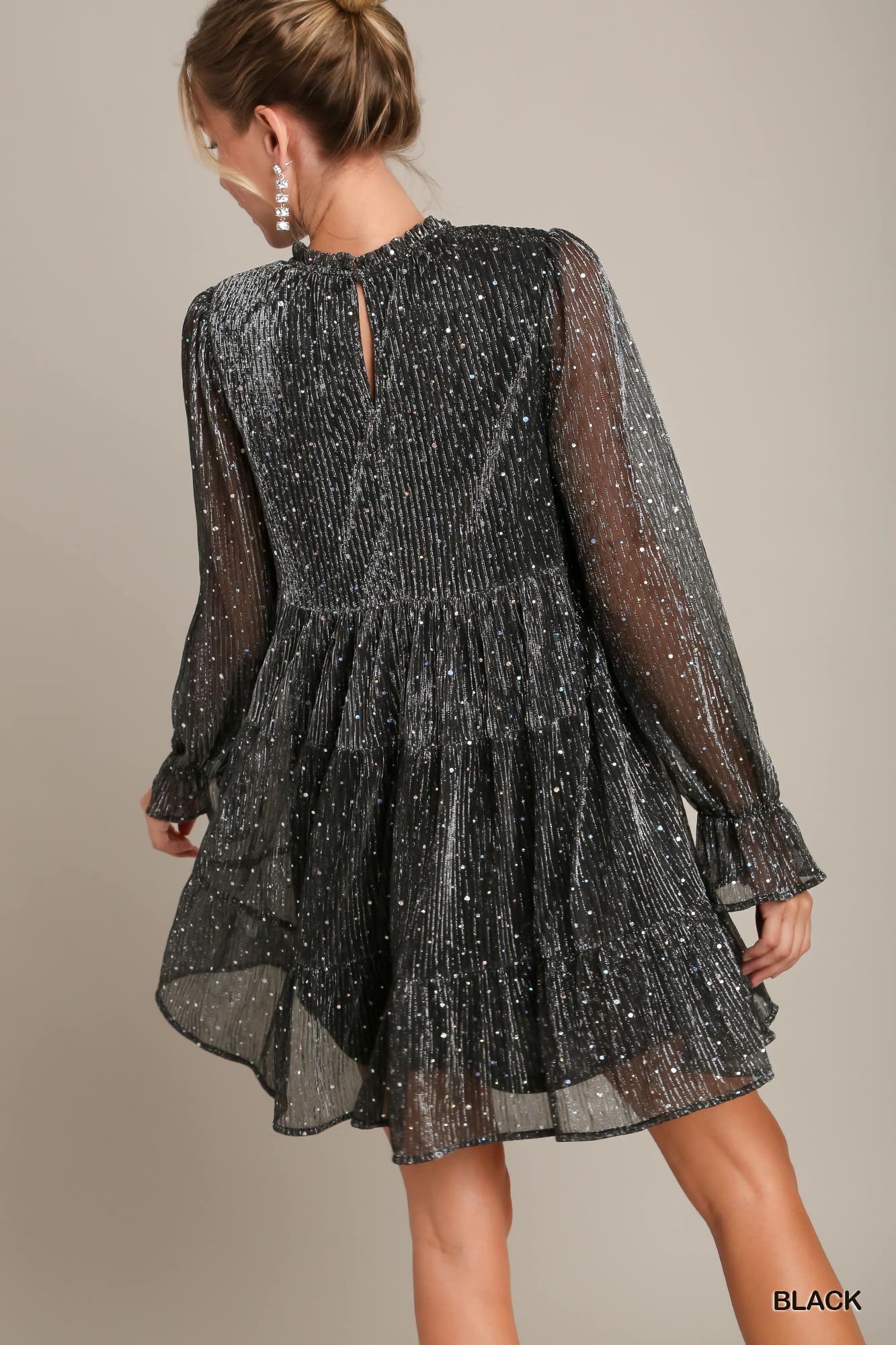 Get ready to turn heads and make a statement with our Metallic Pleats Shimmer Tiered Dress in Black. Add it to your cart now and experience the perfect blend of fashion and glamour!