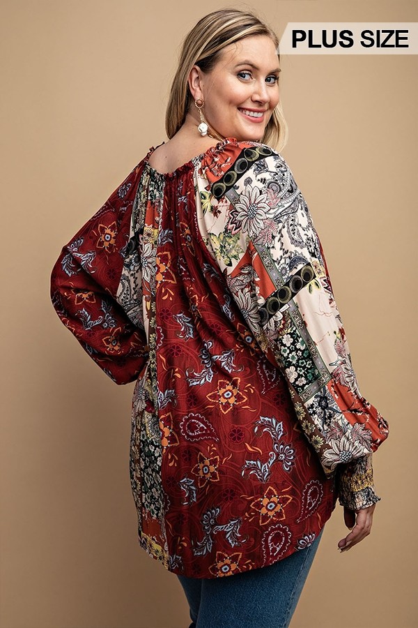 Indulge in the unique charm of mixed prints coupled with the stylish front button detail, making this top a standout choice for any occasion.