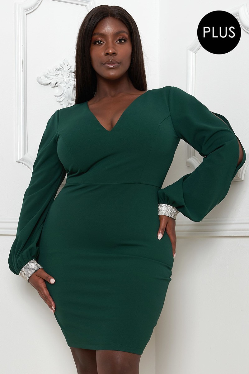 RHINESTONE CUFFS PLUS SIZE MINI DRESS. V-NECK. BALLOON LONG SLEEVE WITH KEYHOLE. ZIPPER BACK. MODERATE STRETCH